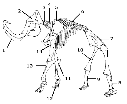 Study the mammoth skeleton below to learn the names of the bones. Then use your knowledge and skills to match the definition to the bone. Refer to the diagram to help you choose the best answer. |